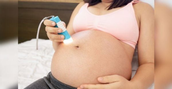 - Mẹ chọn chỗ ngồi thoải mái sau đó dùng đèn pin di chuyển dọc theo bụng.